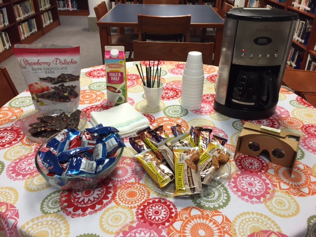 When I came back to school at the end of August, I was excited to share the things that I learned while at the Google headquarters. Through a series of fortunate events, a number of teachers and administrators came to visit the library early on in the year and had the opportunity to test out the Google Cardboard that I received while at Google. It probably helped that I lured them in with chocolate, caffeine, and the promise of a virtual beach vacation (if only for a few moments!). I was fortunate to receive 35 VR viewers through funds received as part of a STEM grant (thank you, Mr. Kotch!), and I was able to put them right to good use.